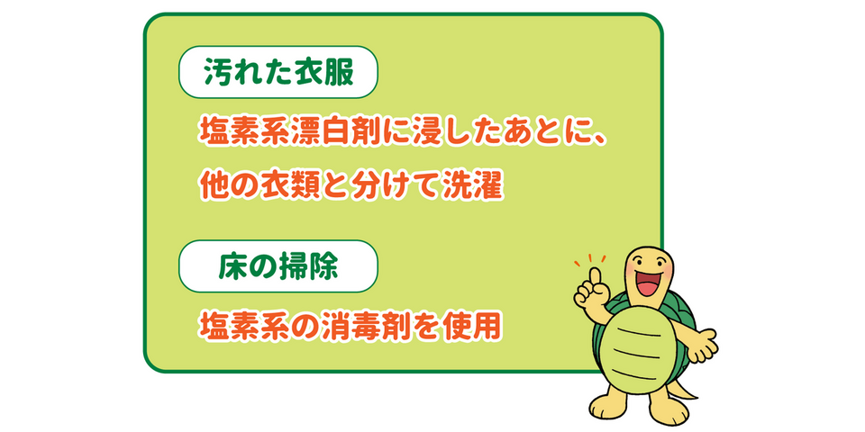 基本的な感染予防対策はうがいと手洗いです。流水と石鹼でこまめに手洗いを行いましょう。感染者がふれた物の消毒にはアルコールが効きにくいため、次亜塩素酸ナトリウムを使いましょう。