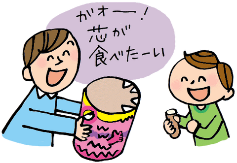 ゴミ箱に顔を描いて「芯を食べたがってる怪獣」に見立てる。「ガオー!芯ちょうだい!」と声をかければ、子どももパパも自然に入れたくなる。 →片付けが遊びに
