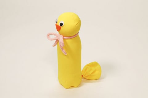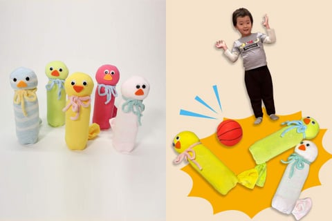 キョロキョロと動く目がなんともキュートな「あひるボウリング」は、靴下とペットボトルで作れる手作りおもちゃ。カラフルなあひるたちが並ぶ姿は、それだけでかわいらしく、あそぶ前からわくわく気分に。ボールを転がして、親子で力を合わせて「ストライク!」を目指しましょう。ペットボトルに入れる水の量を変えるだけで、難易度を簡単に調節できます。