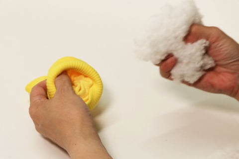 2.切り取った指部分にわたを詰めます。