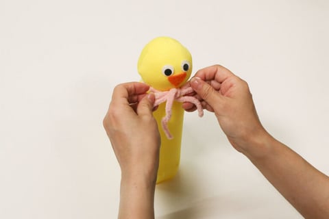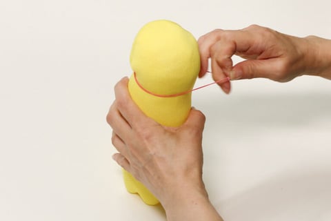 4.首(ペットボトルのキャップの下あたり)としっぽの部分を輪ゴムでとめます。