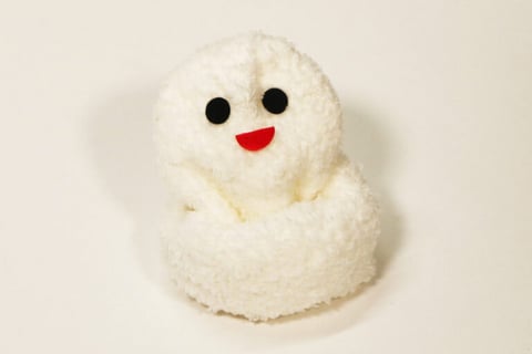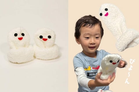 もこもこ素材の靴下をくるくると丸め、目と口をつけるだけで完成する「おもちちゃん」。お顔を引っ張ると、まるでおもちが“びよーん”と伸びるように見えて、とってもユーモラス。思わず親子で笑ってしまうこと間違いなしです。
