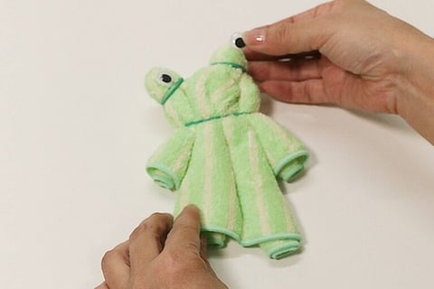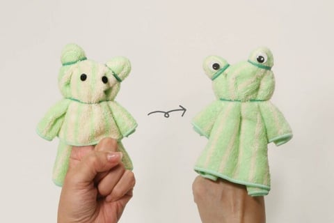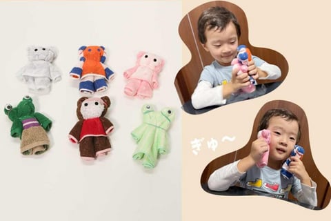 タオルハンカチを折りたたんで作る“ケロクマちゃん”は、色や柄によってまるでお洋服を着ているように見えるかわいいお人形。おもてはクマ、裏返すとカエルに変身! とってもユニークで、プレゼントにも喜ばれます。指人形として物語をつくってあそべば、親子の会話も広がりますよ。