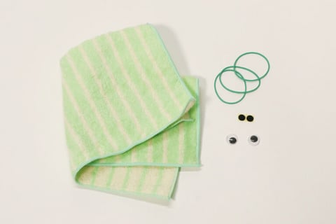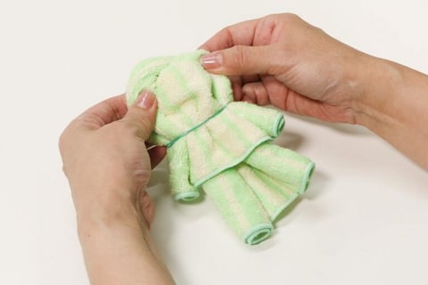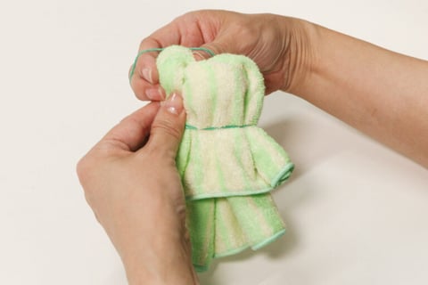 3. 巻いた部分を外側に開くように形を整えて、首と耳(目)あたる部分を輪ゴムでキュッとしぼってとめます。裏側も整えます。