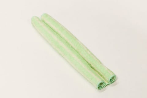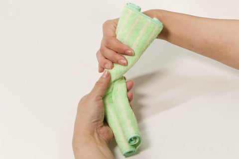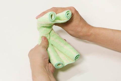 1.タオルハンカチを広げ、上下の両端をそれぞれ中央に向かってくるくると丸めていきます。
