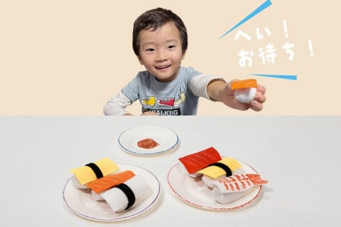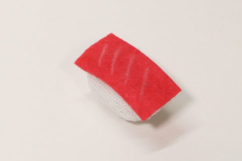 軍手の指先の部分にわたを詰めて縫えば、ふっくらとしたシャリのできあがり! あとはお好みのネタの色のフェルトを切って、色鉛筆やペンで模様をつければ、本物そっくりのにぎり寿司に変身します。「まぐろにしますか?それともたまご?」なんて声をかけながらあそべば、まるでお寿司屋さん気分。「へい、お待ち!」と差し出せば、お子さんも大喜びです。親子で交代しながら、お寿司屋さんごっこを楽しんでみてくださいね。