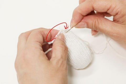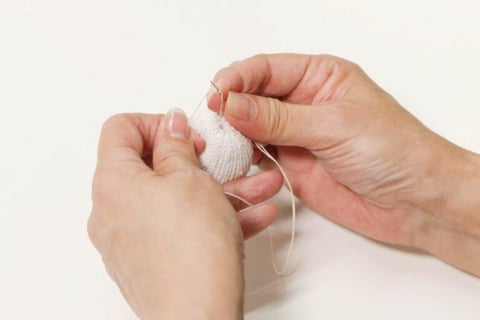 4.一周縫った切り口のフチを指で内側に押し込み、わたが出ないように糸をひっぱりながら口を縫い閉じ、しっかり玉留めをします。