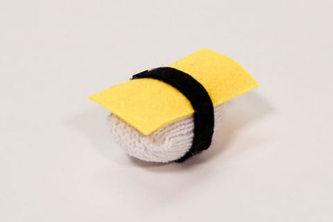 6.小さく切った面ファスナー(凸凹)をそれぞれたまごの海苔の端っこに接着剤で付けます。シャリにたまごをのせて、くるっと巻きつけたらできあがり!