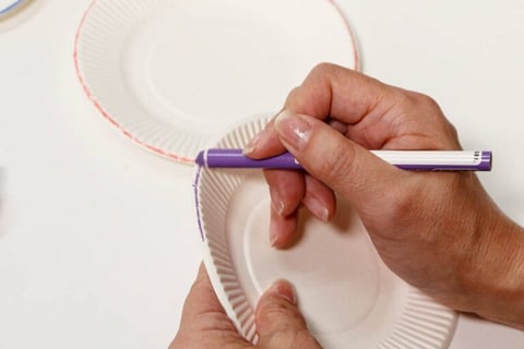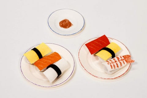 紙皿のフチに色鉛筆で色をつけたり、紙皿の真ん中に茶色い色鉛筆でしょう油を描いてあげると、よりリアルなお寿司屋さんになります。
