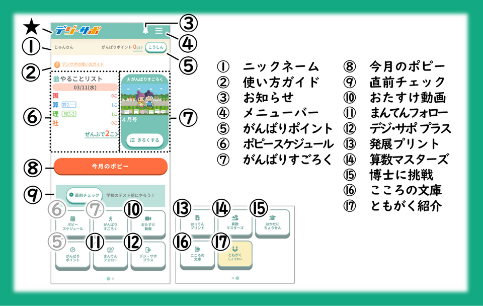 デジ・サポは、お子さまの学習ややる気をサポートするシステムです。ポピーの紙教材を使った勉強が、デジ・サポを使うことでより効果的に、楽しく、続けやすくなります。