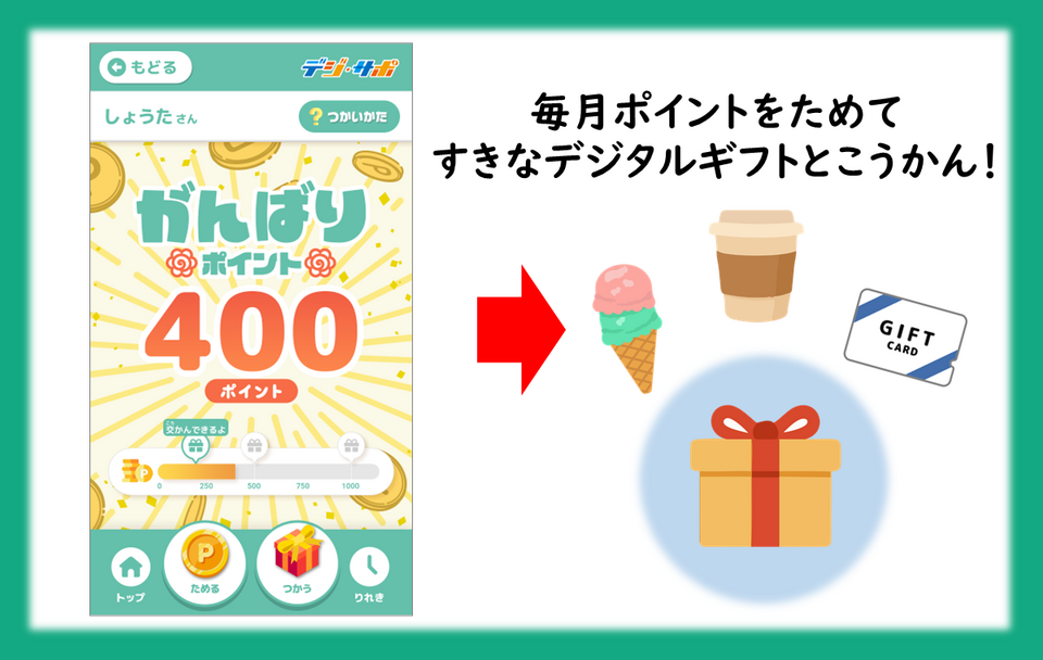 獲得したがんばりポイントが表示されています。ポイントページに移動すると、ポイントを貯めたり、ポイントを使ってデジタルギフトに交換したりできます。