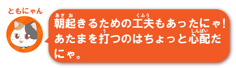 ・お母さんに起こしてもらう。でもやっぱり頭がぼーっとしているから、布団に頭を打ち付けて目を覚まさせる。(けいくんさん)