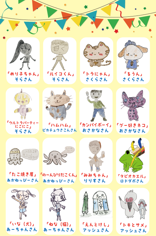 このページでは、みなさんが心を込めて描いてくれたオリジナルキャラクターを、ずらりとご紹介します✨
