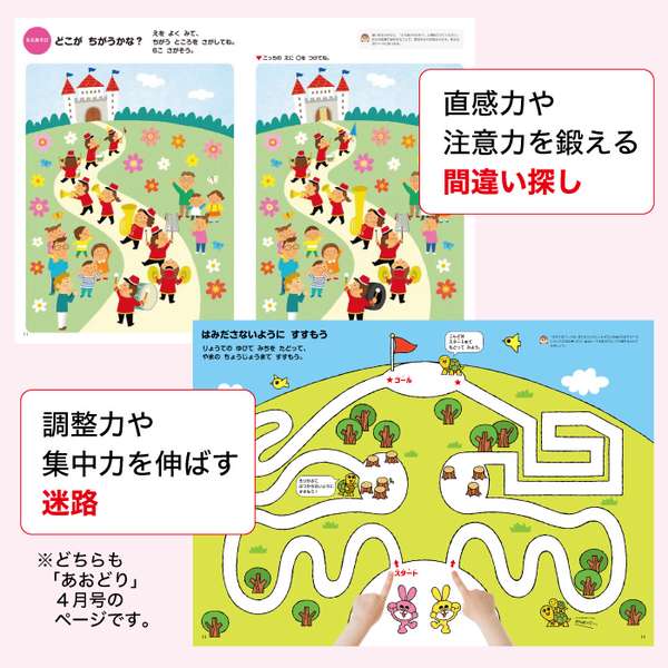 間違い探しや迷路、見つけ遊びなど、子どもが好きな遊びを通してしっかり学習できます!