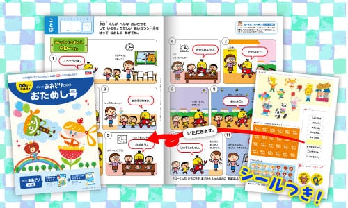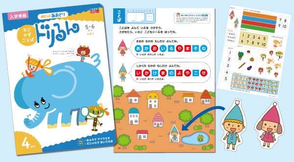 国語・算数の土台となる「もじ・かず・ことば」が、シール貼りや塗り絵などの遊びを通して楽しく学べます。お届けする4月号では「ひらがな(書く)」「10までの数」「あいさつの言葉」などに取り組めます。