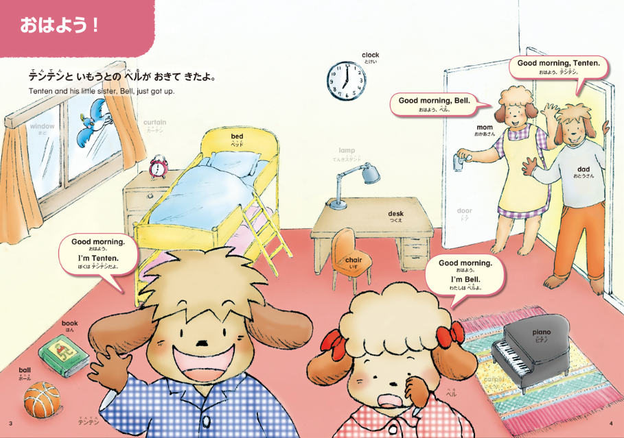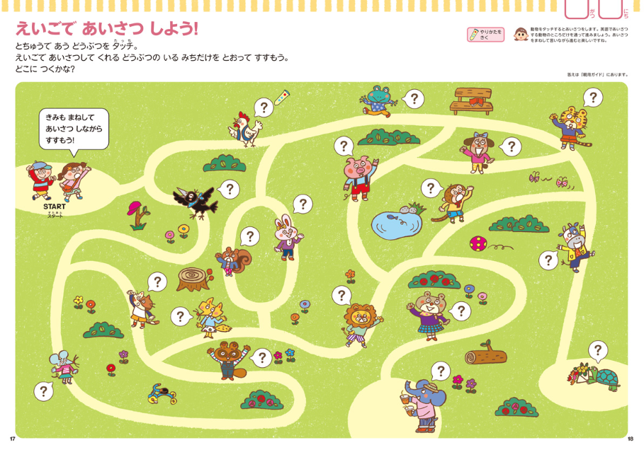 間違い探しや迷路など、子どもが好きな遊びを通して何度もくり返し英語を聞けます。