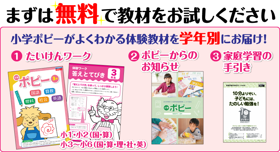 小学生のお子さまは、ぜひ小学ポピーの体験ワークに取り組んでみてください。