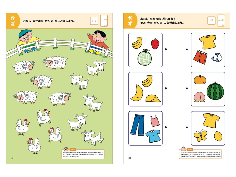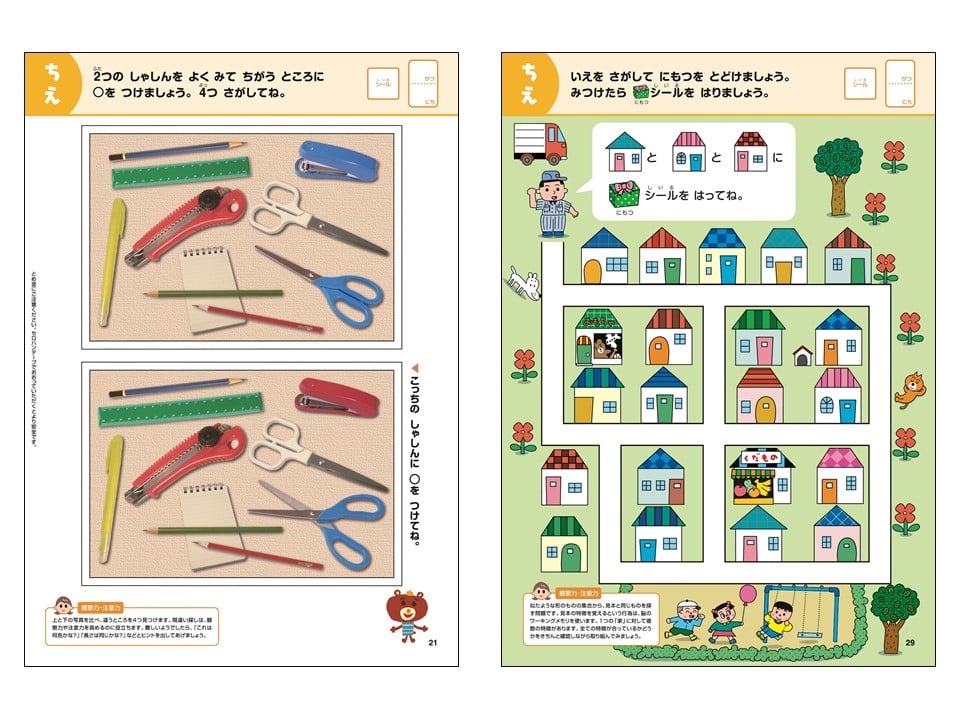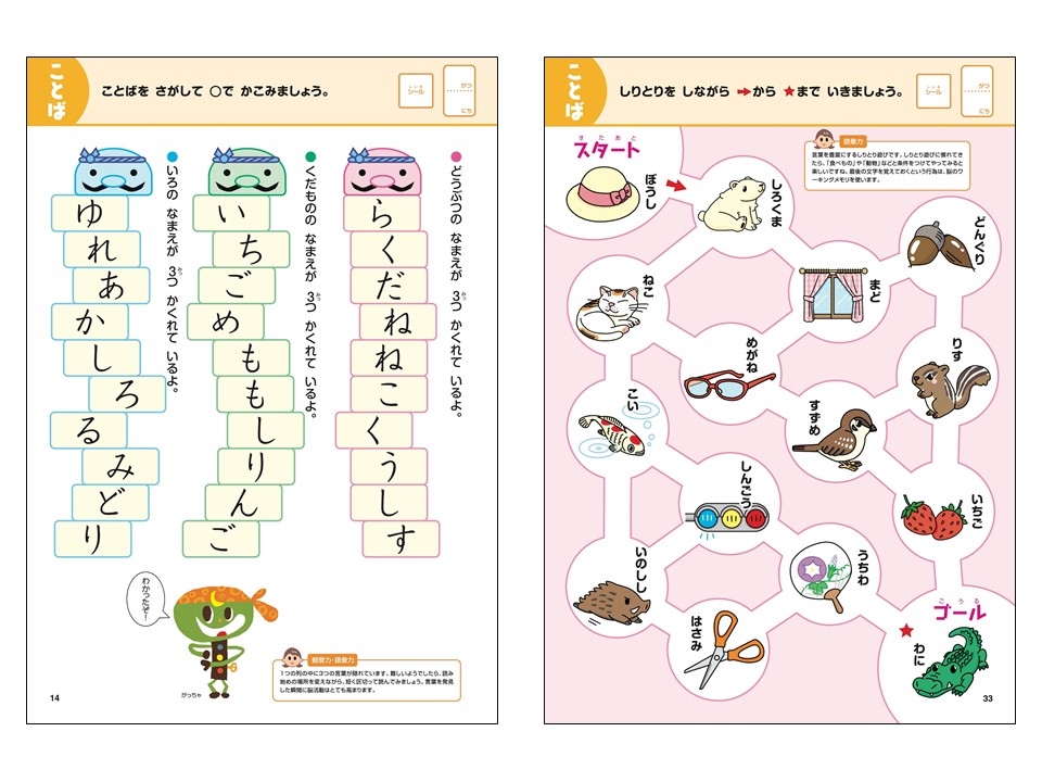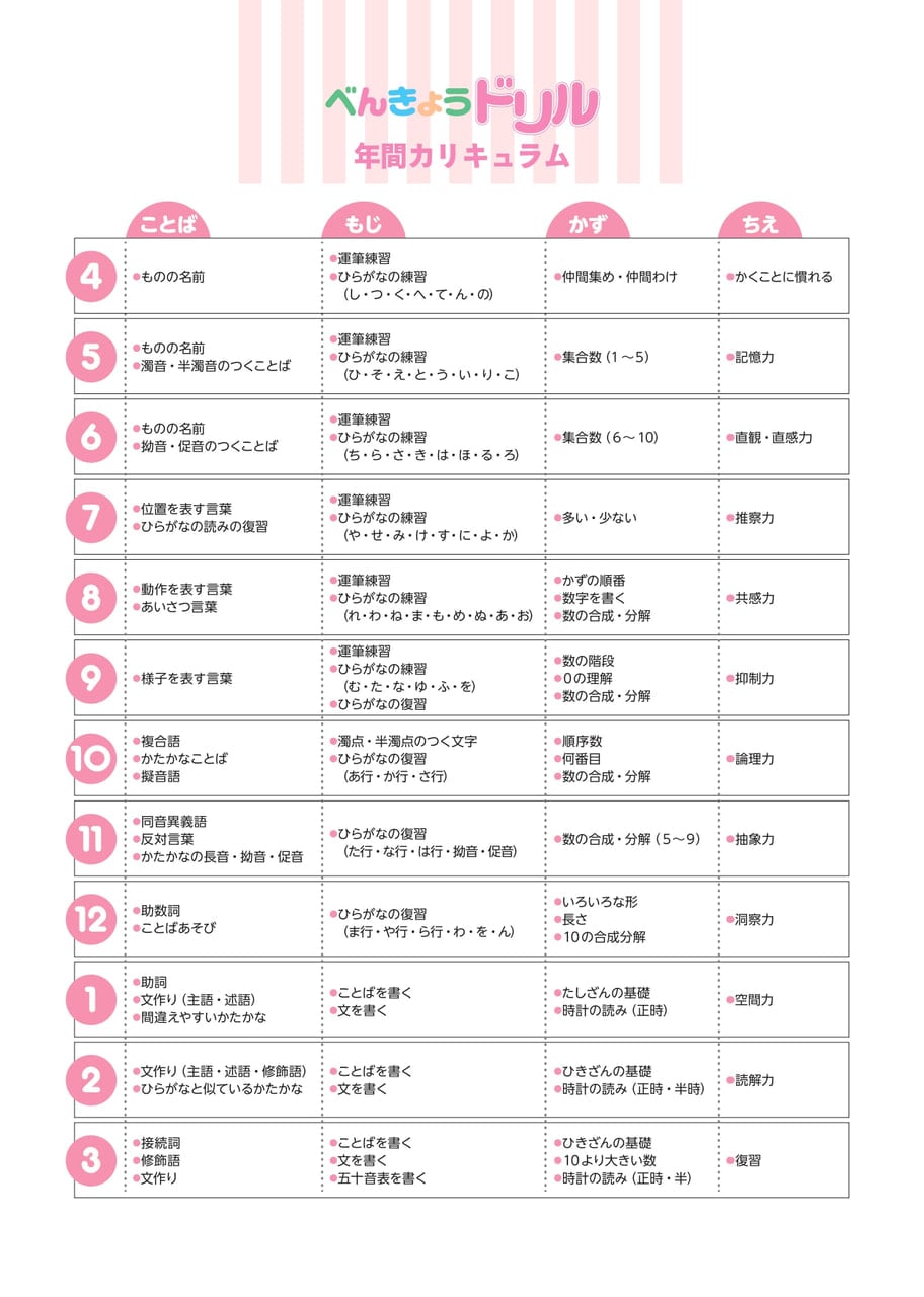 小学校入学までに必要な、「もじ・かず・ことば・ちえ」などをバランスよく身につけられる学習教材です。