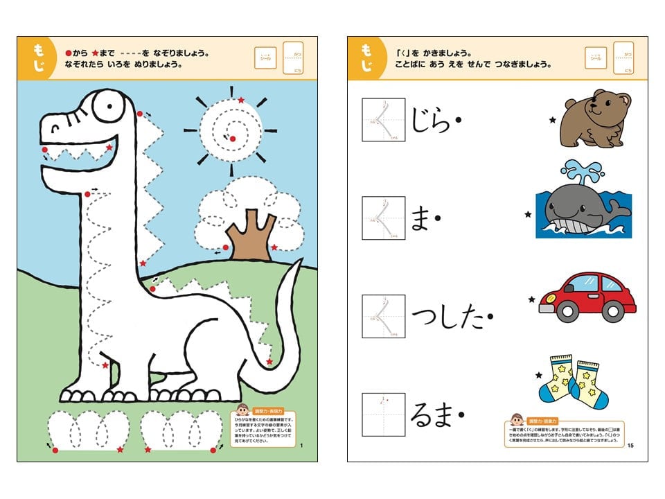 ひらがなの書き練習は一筆書きの文字から始まるので、無理なく身につけることができます。