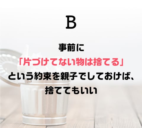 【 B 】事前に「片づけてない物は捨ててもいい」という約束を親子でしておけば、捨ててもいい