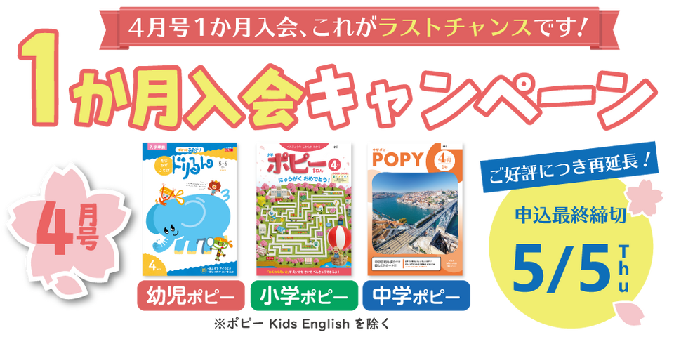 抜粋版のおためし見本ではなく、実際に1か月分の教材を使って内容を確かめられるので、ポピーを始めるイメージを体感してみたい!という方には絶好のチャンスです!ぜひ、お気軽にお試しください。