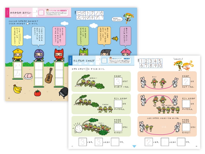 シールやさがし絵などの「あそび」の要素がいっぱいで、文字・数・言葉の学習が無理なく楽しくできます。