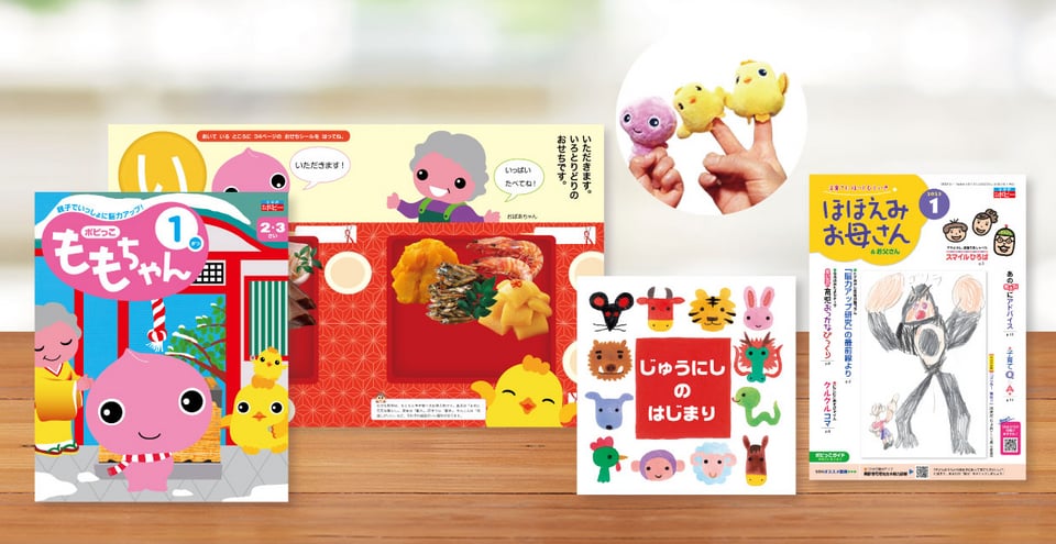 「こころ・あたま・からだ」をバランスよく育てられる「ももちゃん」、お出かけや寝る前に活用できる「ミニ絵本」、おうちの方向け情報誌の「ほほえみお母さん & お父さん」をお届けします。
