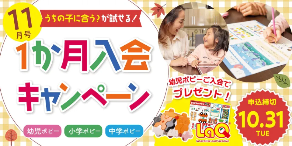 ただいま11月号1か月入会キャンペーン(ポピー Kids Englishを除く)を実施中です!
