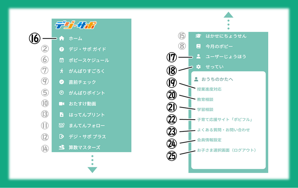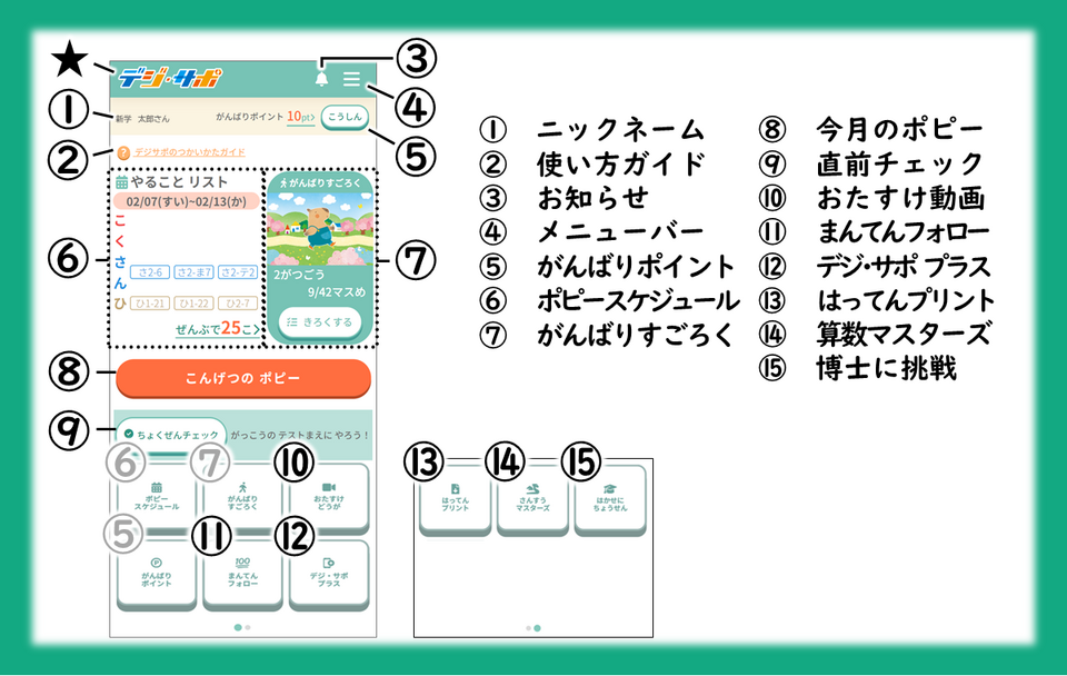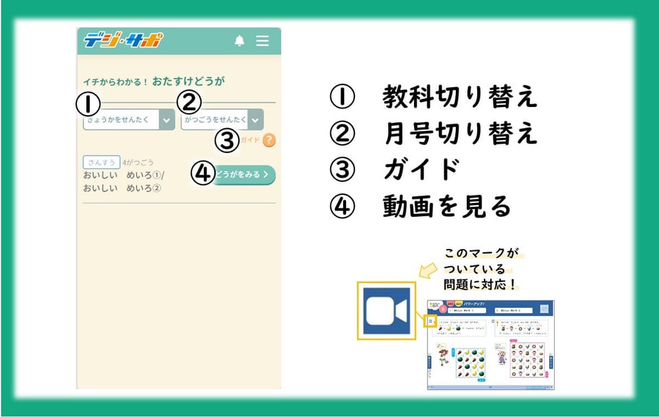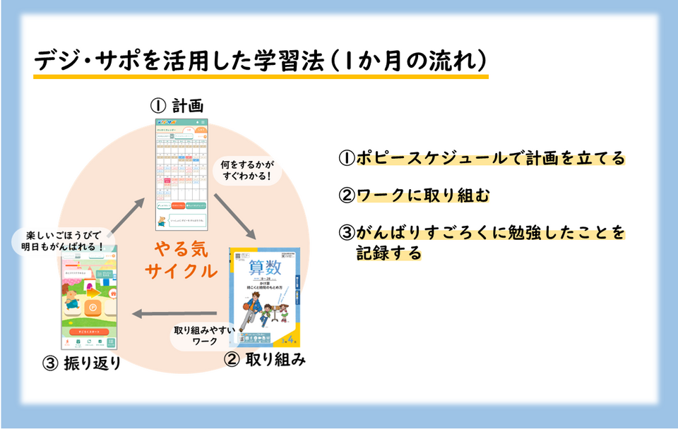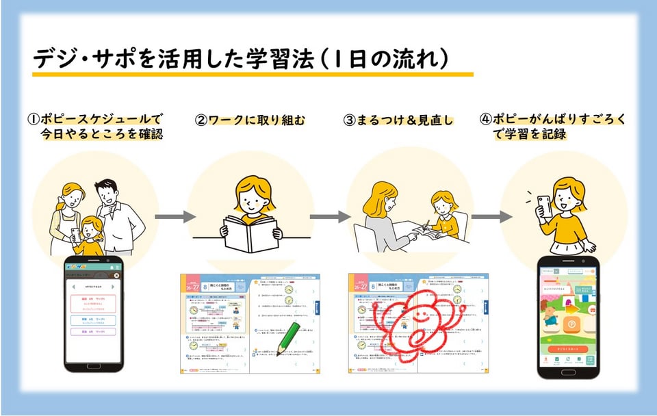 デジ・サポは、お子さまの学習ややる気をサポートするシステムです。ポピーの紙教材を使った勉強が、デジ・サポを使うことでより効果的に、楽しく、続けやすくなります。