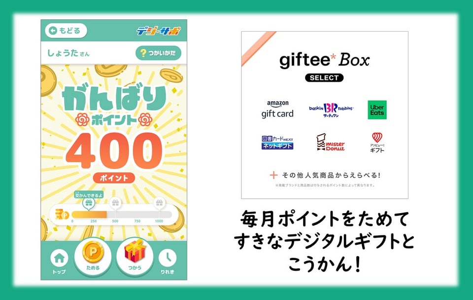 獲得したがんばりポイントが表示されています。ポイントページに移動すると、ポイントを貯めたり、ポイントを使ってデジタルギフトに交換したりできます。
