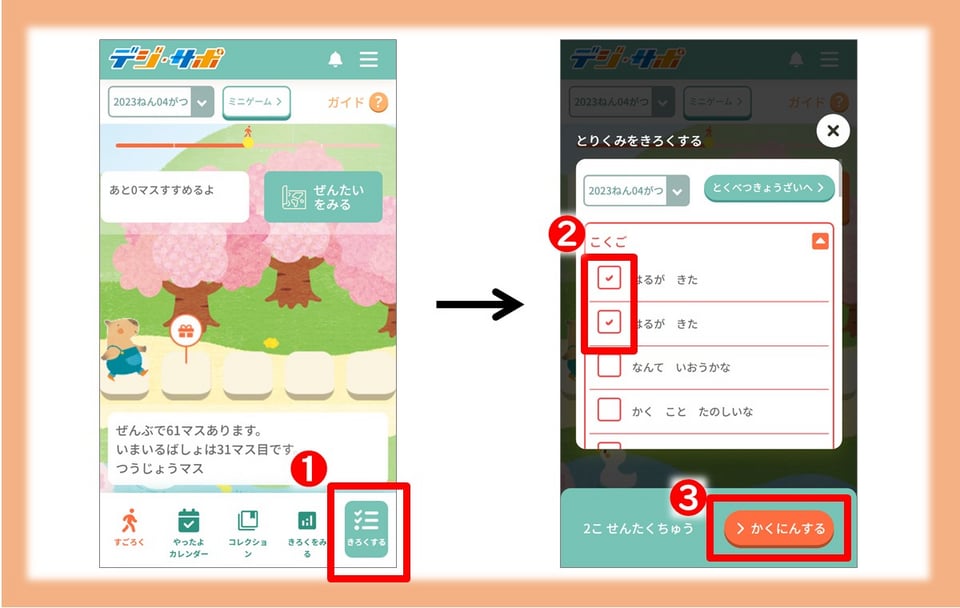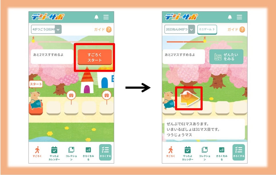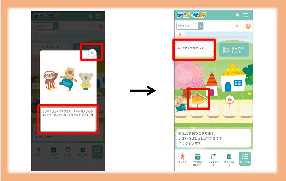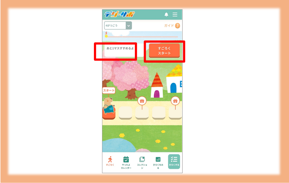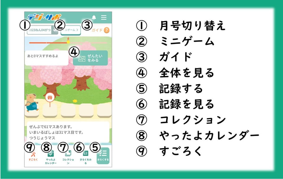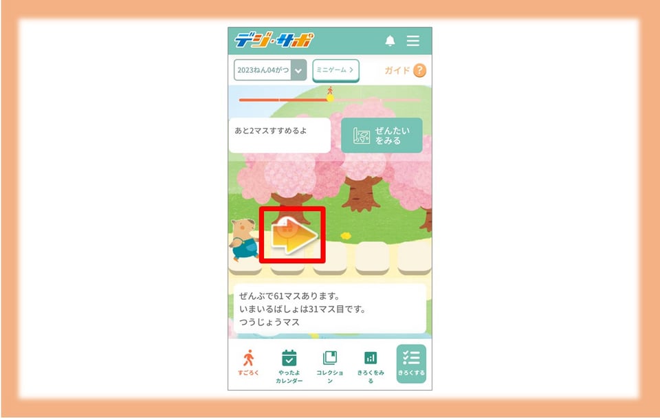 今月のポピーにどれだけ取り組んだかが表示されています。すごろくページに移動すると、取り組みを記録したり、すごろくを進めたり、ごほうびを手に入れたりすることができます。