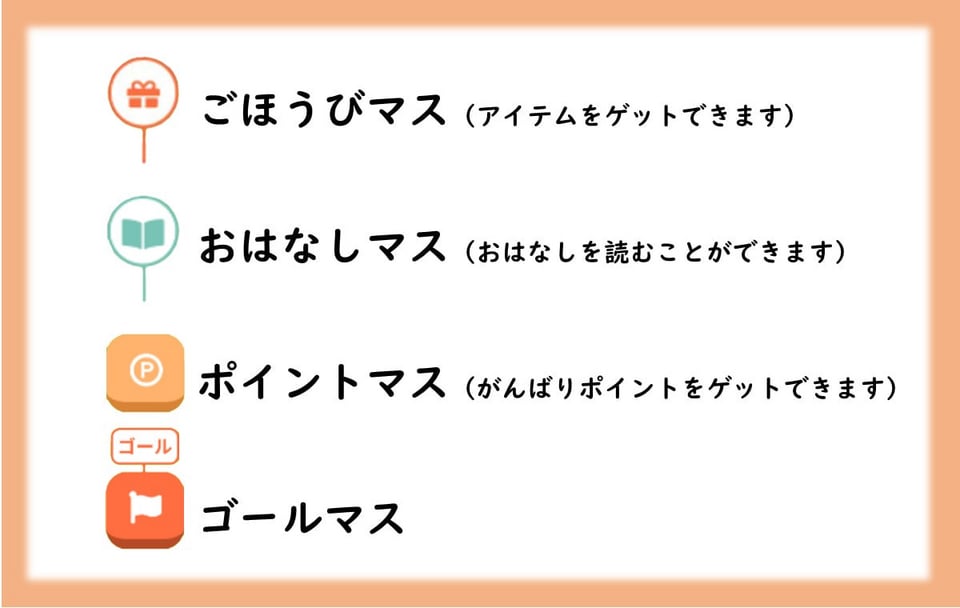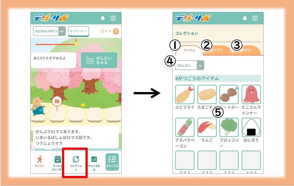 ⑤ それぞれのアイテムをタップすると、アイテムの詳細が表示されます。(おはなしのイラストをタップすると、おはなしを読むことができます)