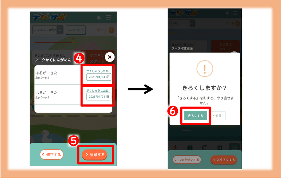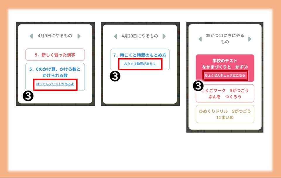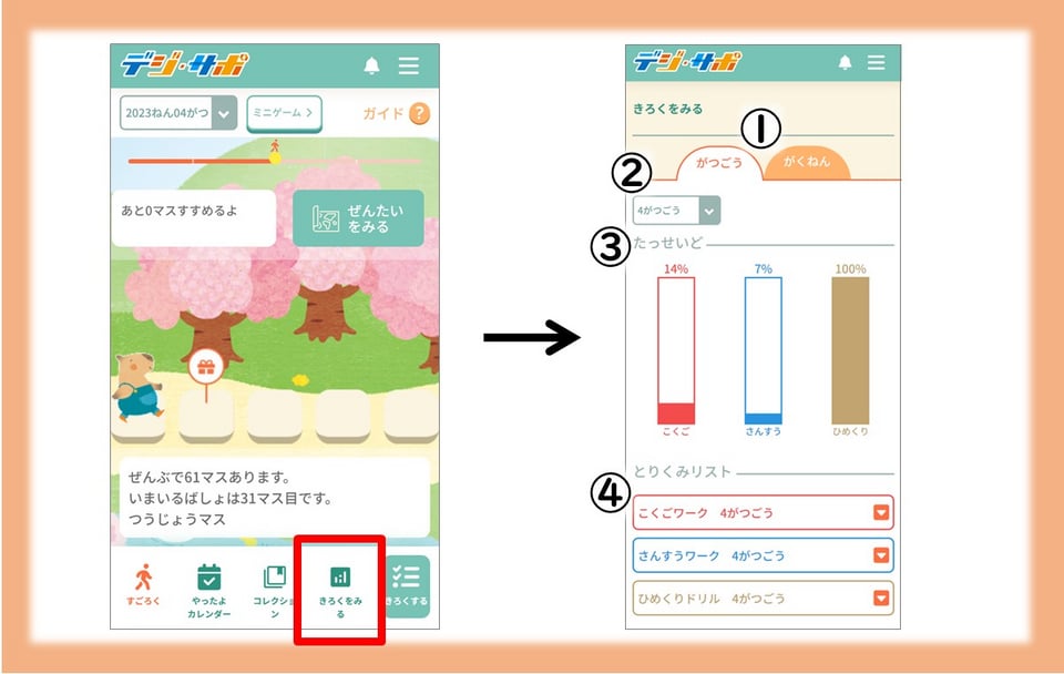 今月号の「ワーク」や「ひめくりドリル」(1.2学年)の取り組みが一覧になったリストです。「がんばりすごろく」で記録した取り組みにはチェックマークがつきます。