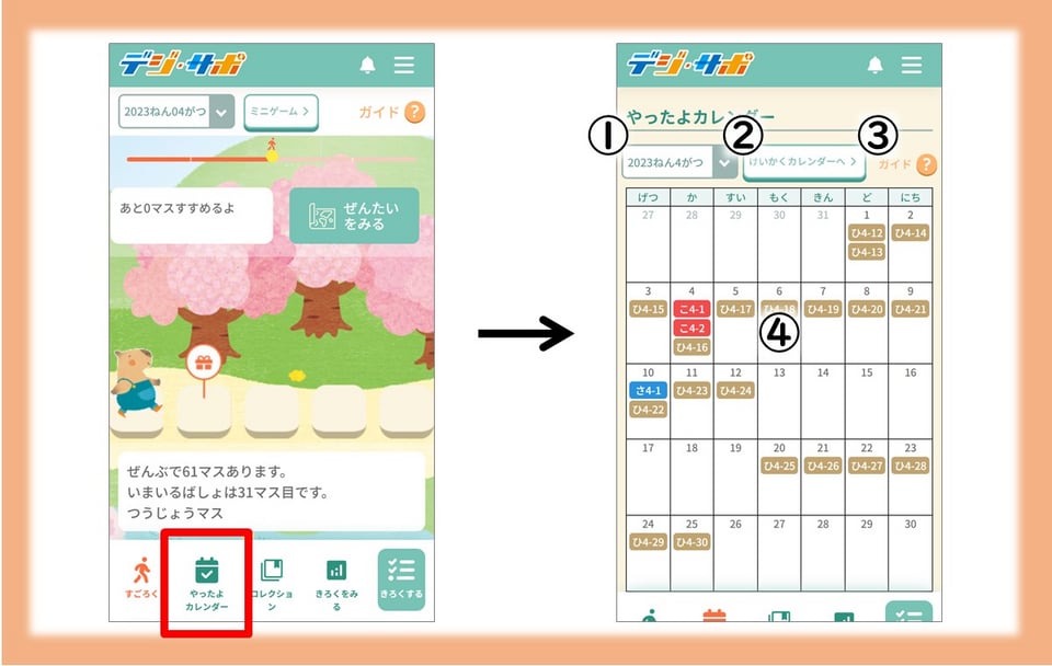 「やったよカレンダー」をタップすると、記録した取り組みがカレンダー上に表示されます。