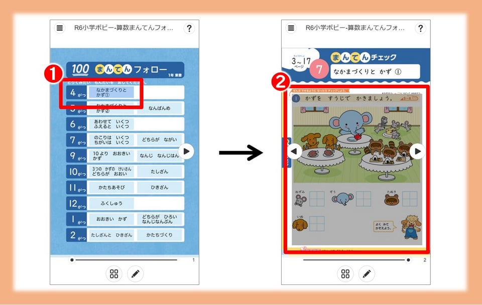 ❷ 選んだ単元の誌面が表示されます。誌面の問題をタップすると、その問題と似た問題に挑戦できます。