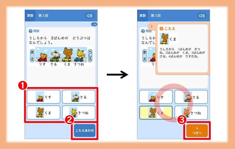 ※ 選択問題のほかに、並べ替え問題や数字のキーパッドを使う問題など、様々な問題形式があります。