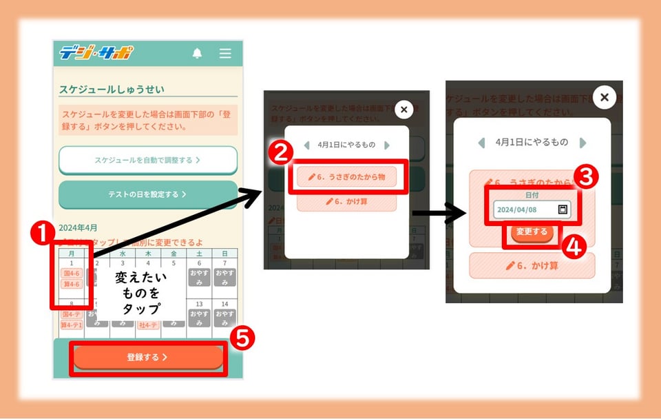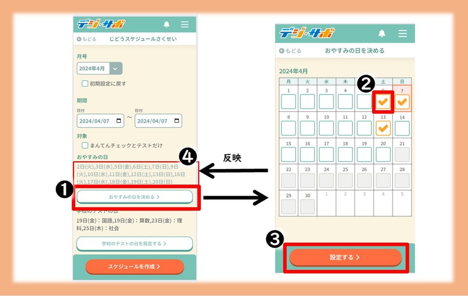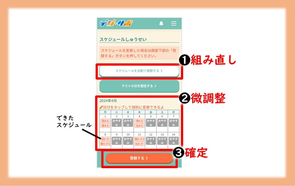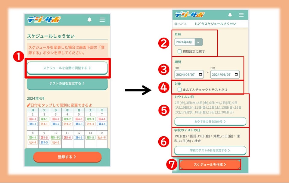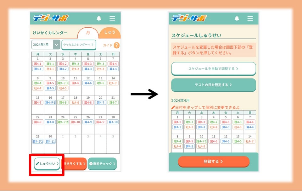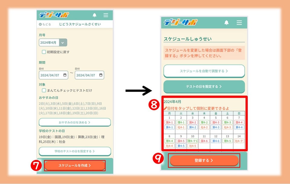今日から7日間に取り組むポピーの単元番号が表示されています。最初は「おすすめスケジュール」が表示されていますが、スケジュールページに移動すると、予定に合わせて学習計画を修正できます。