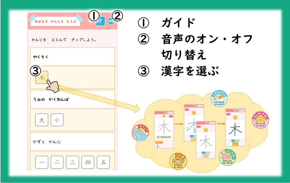 ※1年生は、ひらがなとかたかなを学習できる「ひらがな道場」「かたかな道場」も使用できます。