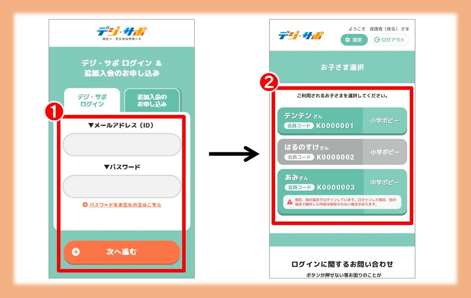 ❷ お子さま選択画面でユーザーを選択します。購読中のお子さまを選択すると、購読しているポピー(小学ポピー・中学ポピー)のデジ・サポページへ移動します。