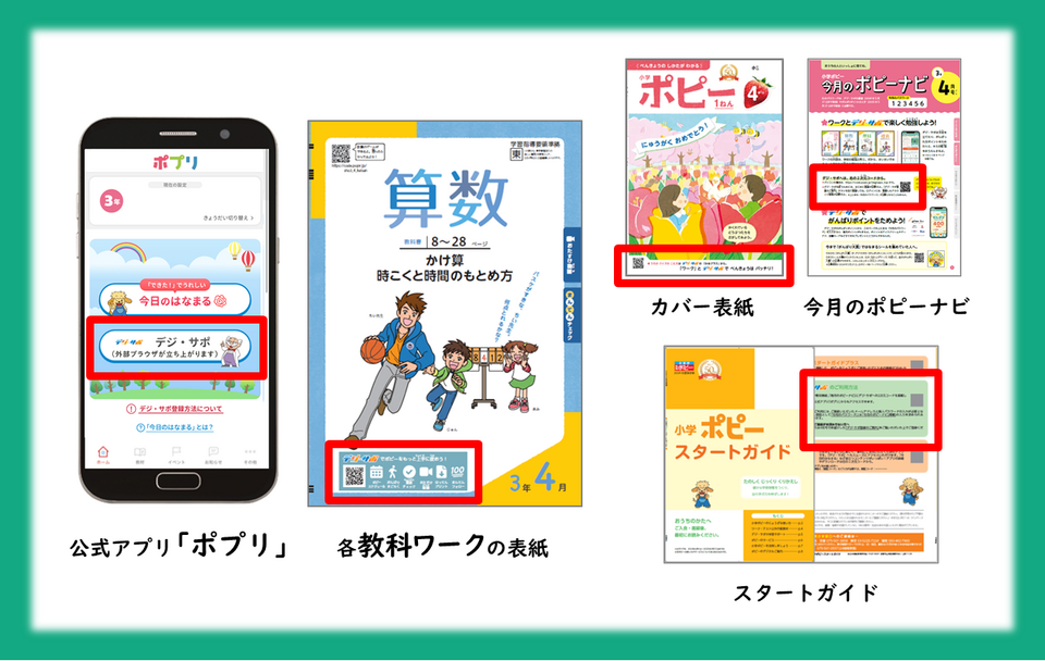 公式アプリ「ポプリ」や、各教科ワーク表紙の2次元コードなどからデジ・サポにアクセスできます。