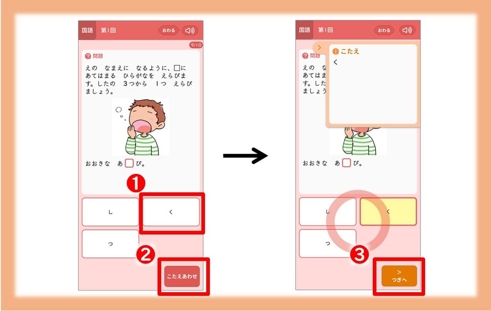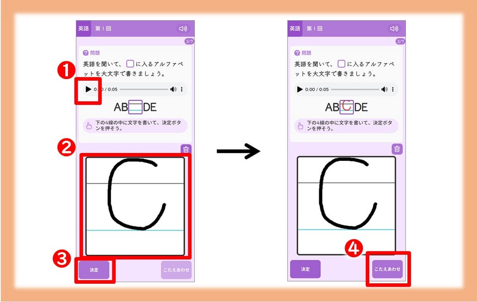 ❹ 上の問題文内の空欄(小さい4線ボックス)に書いた字が反映されたことを確かめたら、「答え合わせ」をタップします。