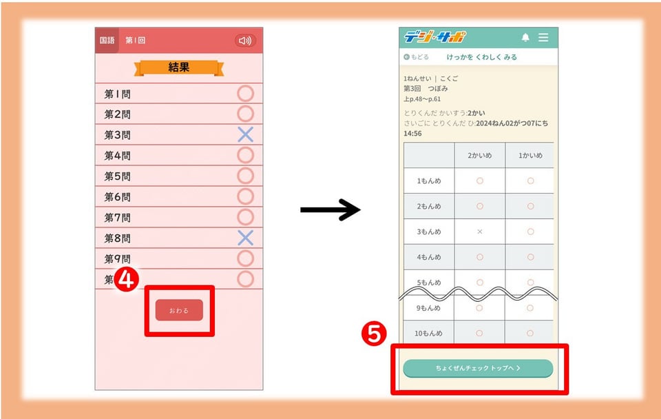 ❺ 結果を確認したら「直前チェックトップへ」をタップしてトップへ戻ります。トップの一覧の「解き直す」ボタンから、間違えた問題だけを解き直すことができます。全問正解するまで何度も解き直しましょう。