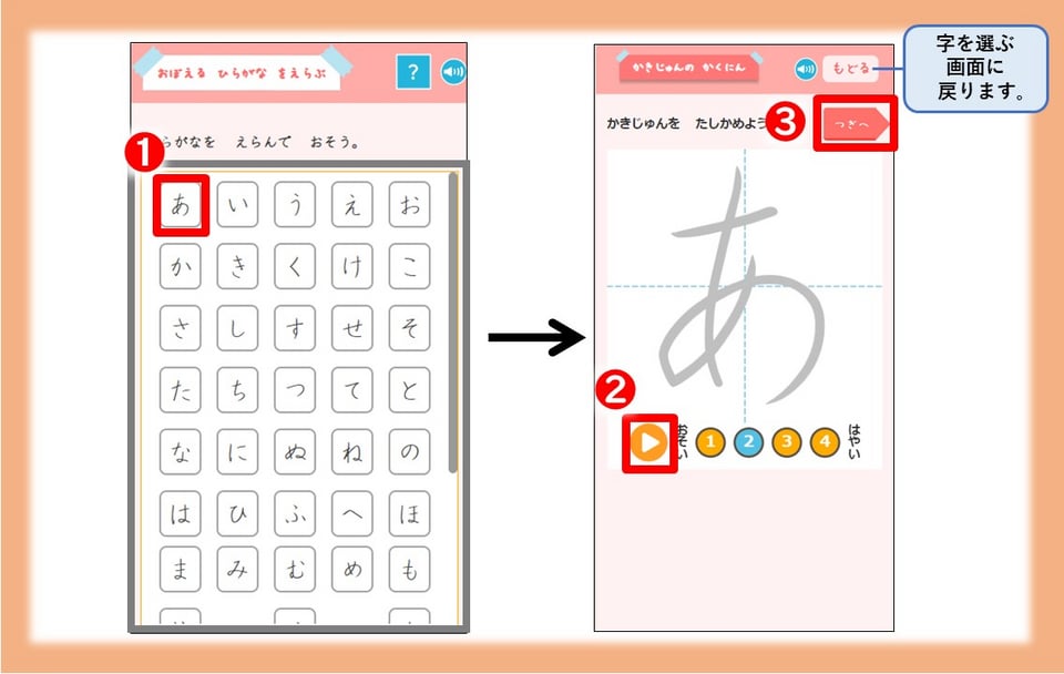 ・「もどる」をタップすると、字を選ぶ画面に戻ります。