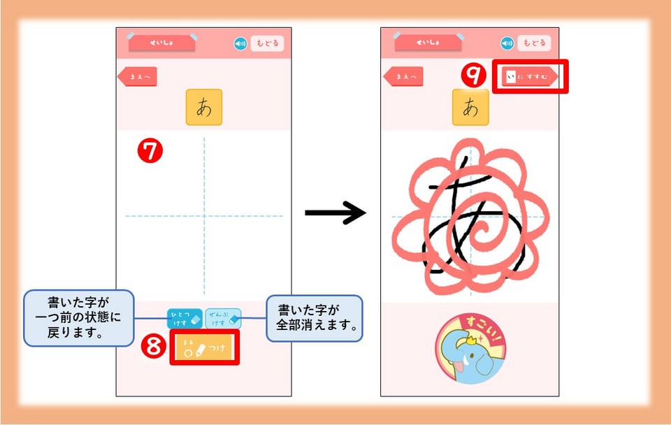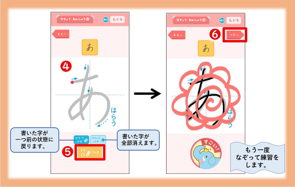 ❹ お手本の上から字をなぞって練習します。間違えたときには、「ひとつけす」または「ぜんぶけす」をタップして、なぞった字を消すことができます。