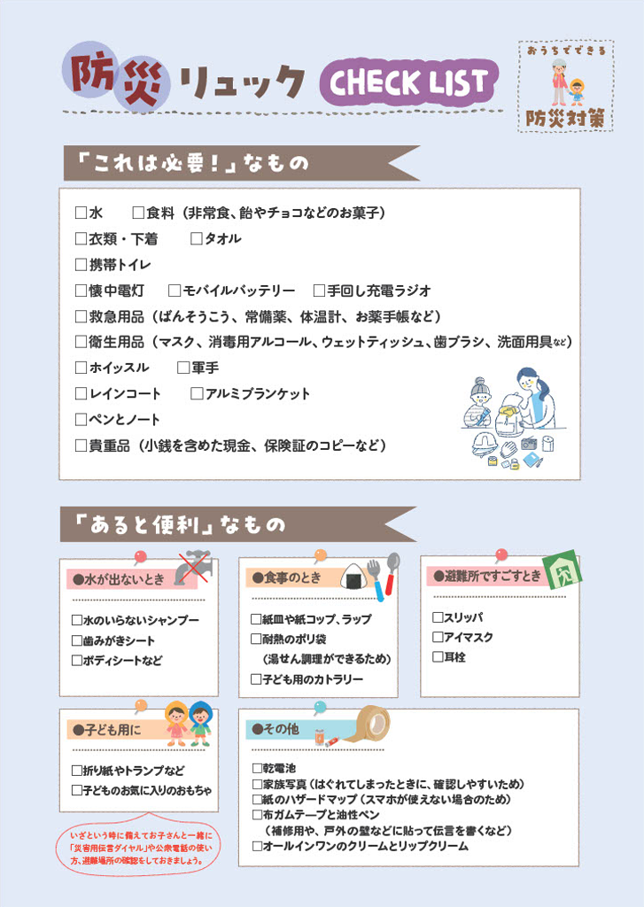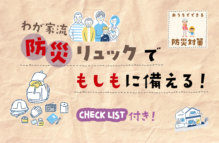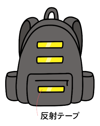 防災対策の一環として、ご家庭で防災リュックを作り、万一の事態に備えておきましょう。使っていないリュックに、暗い場所でも目立つように反射テープ(100円ショップでも購入できます)を縫い付けたら、準備OKです♪