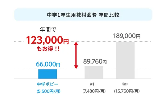 中学ポピーは余分な付録がなく、学年にあわせた適度で良質な教材です。本当に必要な教材だけをお届けするので、学習塾や他の通信教材などの受講料と比べても続けやすい価格です。