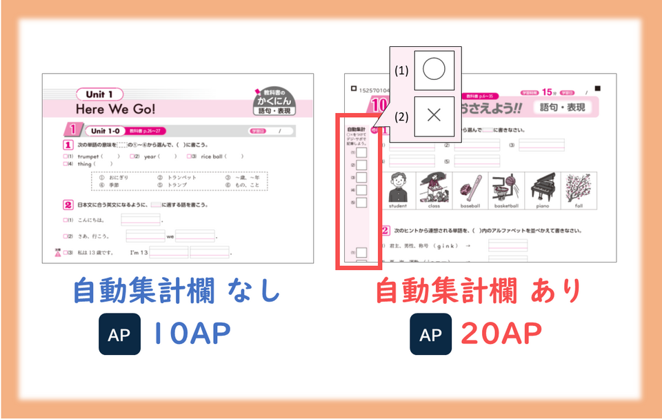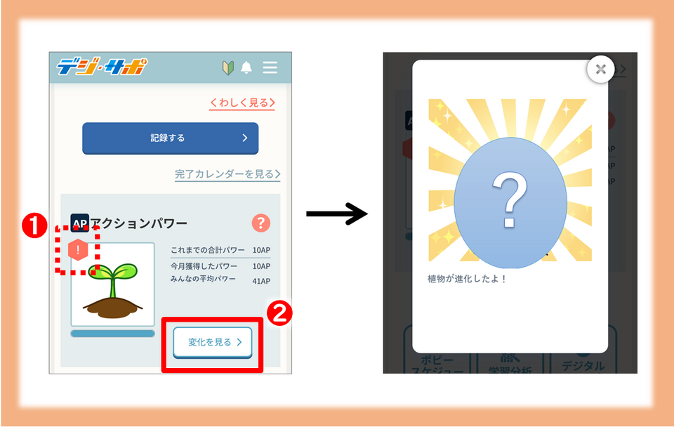 APがたまると、イラストが成長したり、がんばりポイントが加算されたりします。