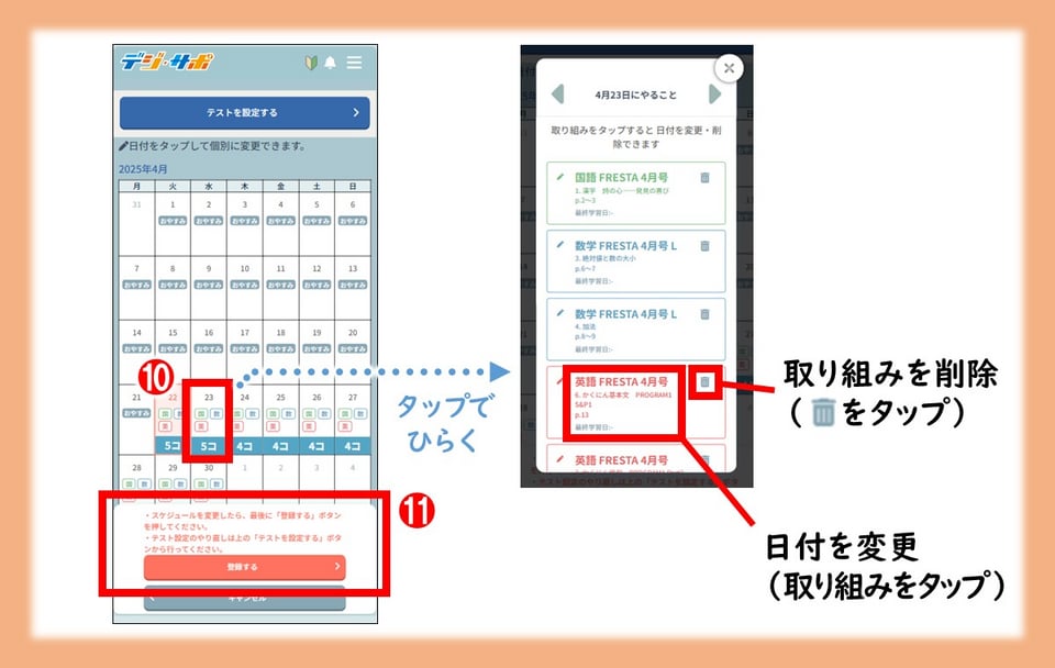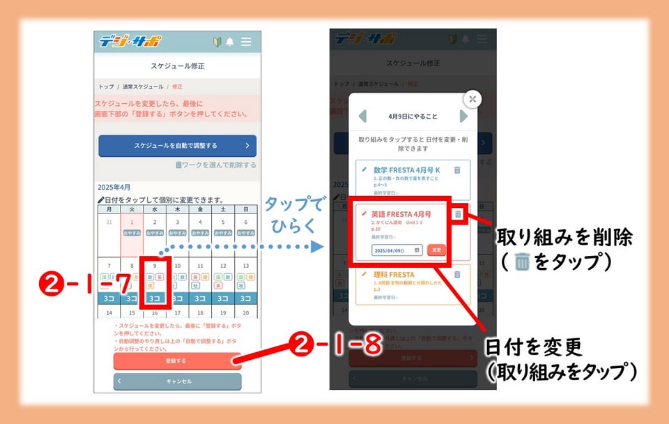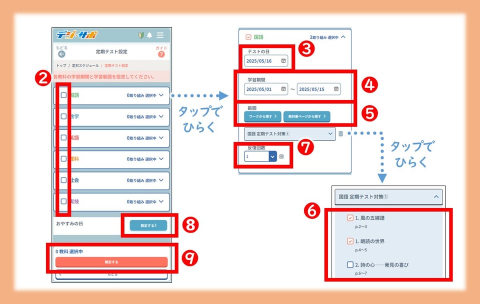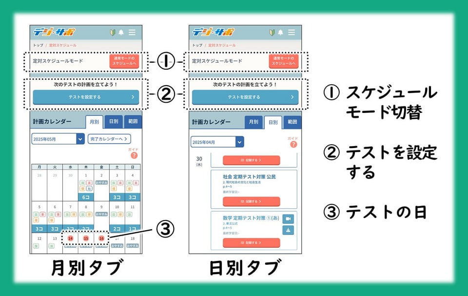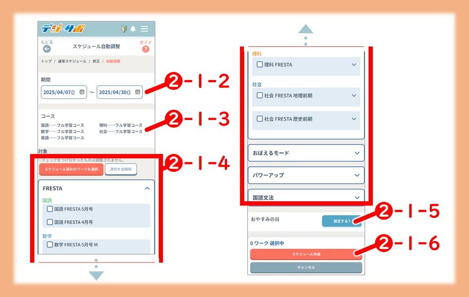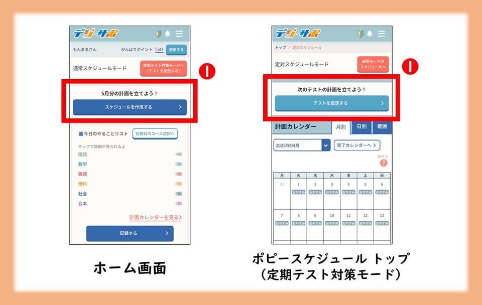 学習スケジュールをデジ・サポが提案する際に、学習コースによってスケジュールされる取り組みの内容が変わります。教科ごとに学習コースを3つの中から選びましょう。