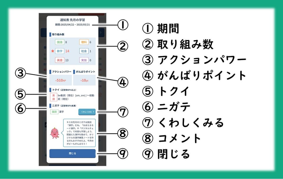 ・がんばりポイントの加算は毎月22日(コンテンツ配信日)に自動で行い、通知表で加算したポイント数をお知らせします。