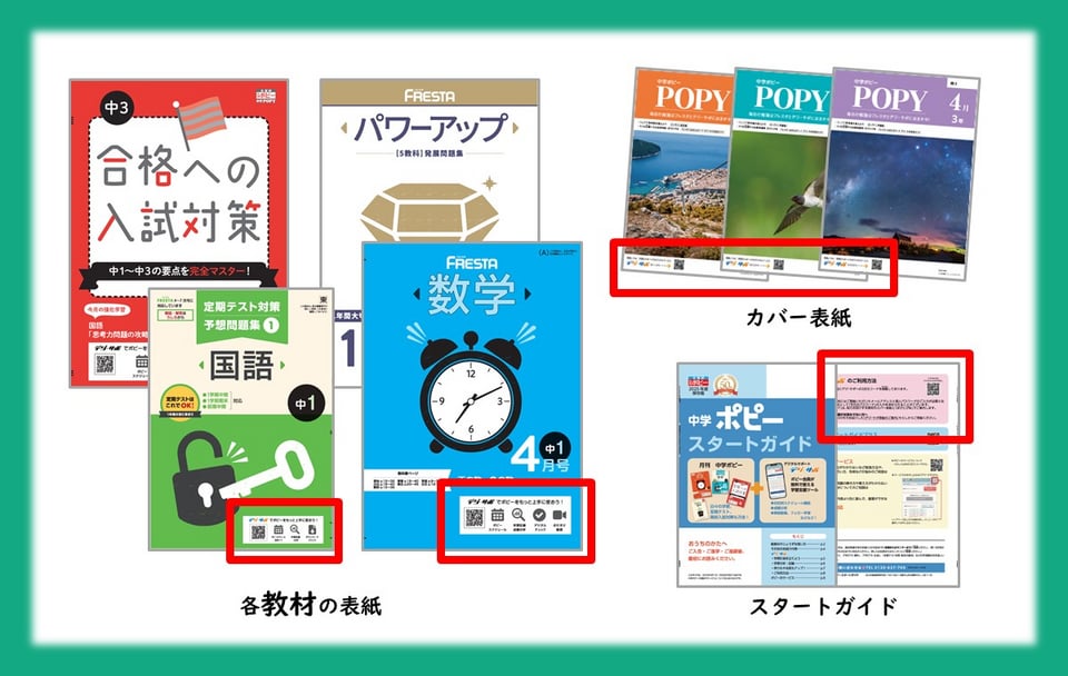 ポピーのカバー表紙や、各教科ワークの表紙にある2次元コードなどからデジ・サポにアクセスできます。